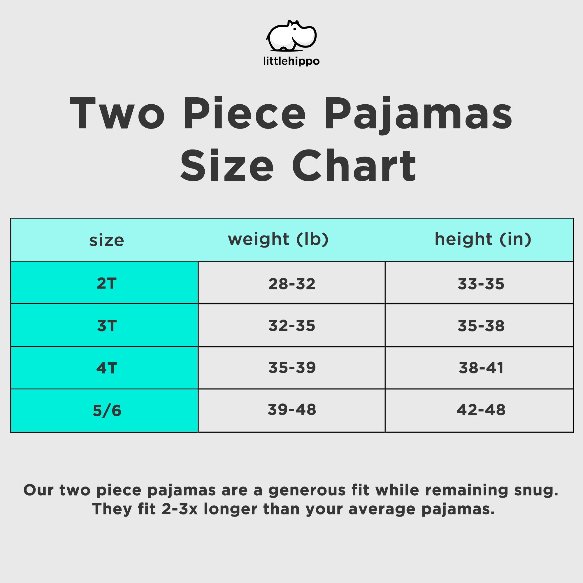 Our pajamas feature extra long sleeves to accommodate your growing child. We recommend purchasing true to size.